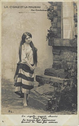 1905? Ten card photographic postcard series of GA, using the whole text of La Fontaine's fable. Numbered I-X. "P.L" and "R.P.I." on each card. $6 each from Bertrand Cocq, Calonne-Ricouart, Sept., '20.