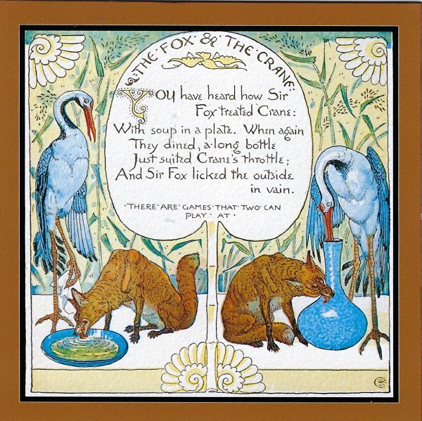 The detail in this reproduction is spectacular. Crane's two-panel approach appeals to me as the way to present this fable. As often, W.J. Linton's text is more comment than narrative.