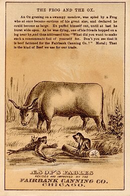"The Frog and the Ox" features a huge, nearly rectangular ox. The story runs as usual. A passing frog says to the dying burst frog that the ox he envied is being fattened for Fairbank.