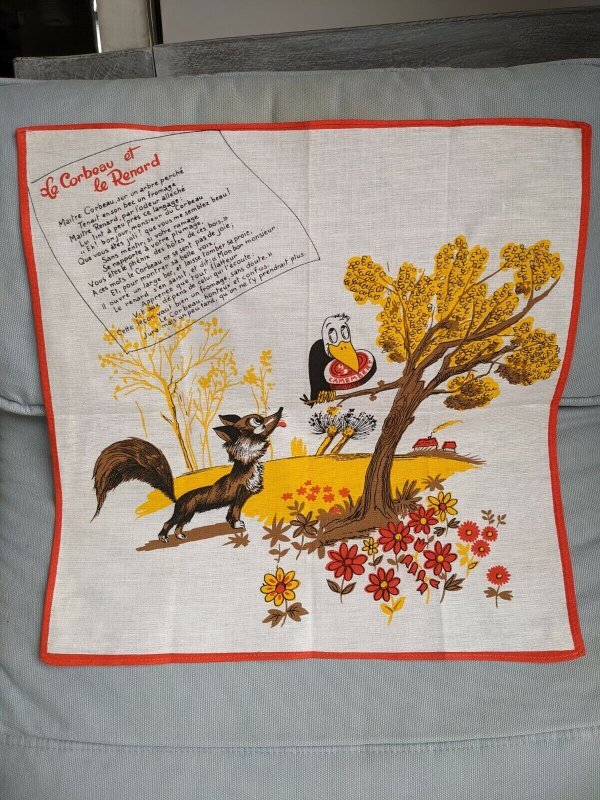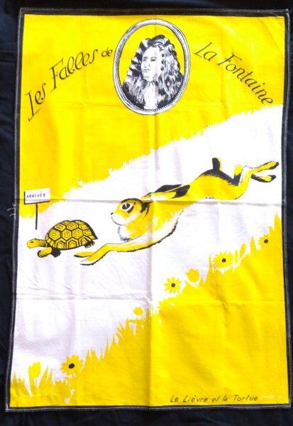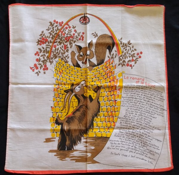 1990? French kitchen towel. "The Fox and the Goat." 16½" square. Cotton. Where and when?