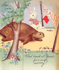The front reads "Hope you're making steady progress…And break all records for a swift recovery!" As the card is unfolded, the tortoise stretches his neck across the finish line marked "Health." The text on the inside is "Show a burst of speed." A disgruntled rabbit with a flag in his paw looks on. The card is signed twice by "Uncle Joe and Aunt Olive." When you click on this card to see it full-size, be sure to notice the second image showing the expanded version!