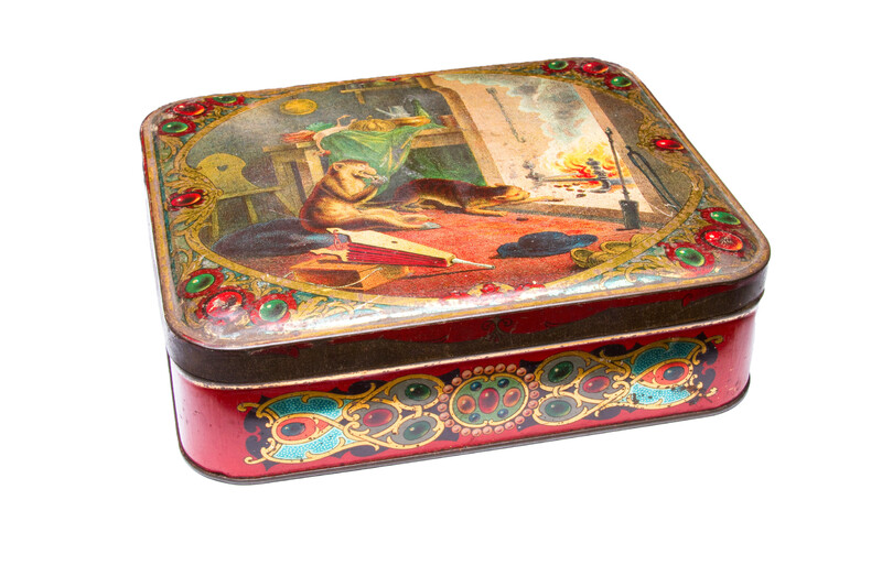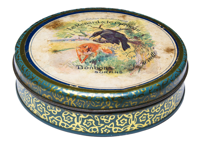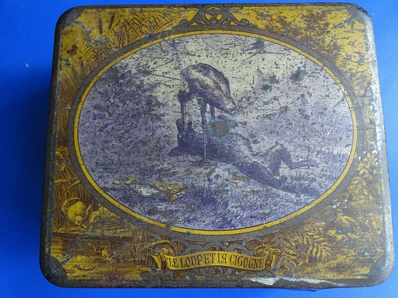1920? Set of 6 tin canisters displaying lithographs of La Fontaine Fables. Sugar tin for $50 from tincollectors@gmail.com, Jan., '20. The other 5 French tin canisters for $109.75 from petitbrocante through Etsy, Nov., '24.