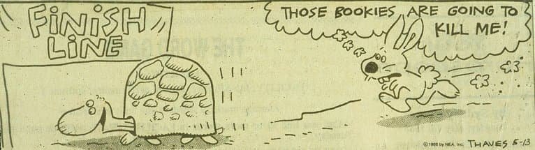 1986 Frank and Ernest. TH cartoon. "Those bookies are going to kill me!" exclaims the frantic hare approaching the finish line with the tortoise leading him. Dated 5-13. Copyright 1986 NEA, Inc. Signed "Thaves." Unknown publication and source.