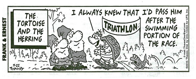 2015 Frank & Ernest comic. “The Tortoise and the Herring.” Triathlon. “I always knew that I’d pass him after the swimming portion of the race.” Photocopy. Thaves. Distributed by Univ./Uclick for UFS. Unknown source.