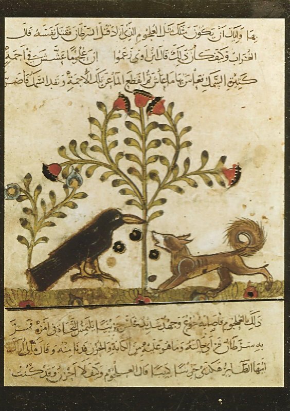 A dapper fox in bow tie holds out a paw to catch the cheese he expects to fall. The crow in snappy hat and vest is holding the cheese firmly in his wing as though it were an arm. A lovely scene!