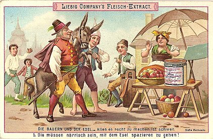 The cartoon asks what might have happened after the fable’s usual ending, which has the ant shutting out the freezing, starving grasshopper. Here the grasshopper kills the ant with his violin and marches off with a bag of grain. Is he waving good-bye? An online entry says that the cartoon was originally published in 1988.