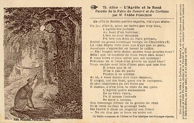 The front of this card contains a black-and-white illustration of FC alongside a parody of La Fontaine's version. Here is how the card itself introduces its text: "72 Allier. L'Agrôle et le Rena, Parodie de la fable du Renard et du Corbeau par M. l'Abbé Forichon." Forichon died in 1879, and this card is postmarked in August of 1932, so that the card must have appeared somewhere during the period framed by these two dates. The verso of the card is completely given over to a written message, without an address or postmark.