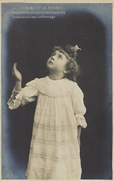 This is a curious set, first of all for its size: most sets of photographic fable postcards include six members, while this set has ten. It is curious next for using a single child to play both parts in this visualization of the fable. Fable depends so much on interaction of two parties; it is a surprise to see each card in this whole series picture just one character. Finally, it is curious for an inversion in Verse 10: Card 5 has "Le Corbeau à ces mots ne se sent plus de joie" whereas the usual texts have "A ces mots le Corbeau ne se sent pas die joie." Is the character on the last card playing the shamed crow or the actor taking a bow?