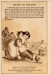 Fairbank Canning Aesop's Fables Revised and Improved by the Fairbank Canning Co, Chicago. Thirteen cards, perhaps the complete set, each transforming an Aesop's fable into an advertisement for Fairbank canned meat. Though the size varies slightly, they are generally 3¼" x 5". Three were a gift of Eleanor R. Webster of Retired Books, Sherborn, MA, August, '91. Others came for various prices from $2.50 to $23.63 from Jane Choras through Payson Hall Bookshop, Belmont, MA, August, '91; Dave Anderson, Monson, MA, through Ebay, March, '99; Jane Davidson, West Yarmouth, MA, through Ebay, April, '00; Dave Cheadle, Englewood, CO, Sept., '99; $35; James Becker, Walden, NY, through Ebay, Feb., '01; Robert Moore, Haverhill, MA, through Ebay, June, '01, Primarily Paper, through eBay, May, '03, Lynne Van Brocklin, Norcross, GA, through eBay, Sept., '03, and Barton Kamp, Worcester, MA, through eBay, Sept., '08. I have extras of most of the cards.