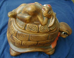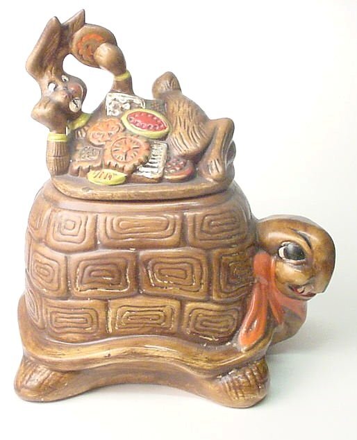 My first fable cookie jar! The plodding turtle carries the hare--complete with carrot--on his back! Now where in the world would something like this have come from?