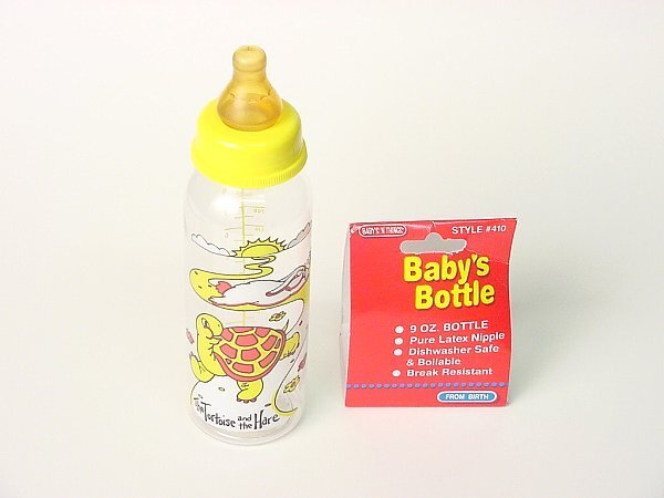1999 Tortoise and Hare baby's bottle. Nine-ounce, boilable, plastic, with a pure latex nipple. Oyster Bay, NY: Baby's 'n Things. With a matching bib $4 from C-N-C Treasures through Ebay, Jan., '01.