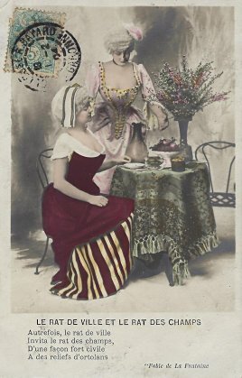 I never want to disagree with Monsieur Cocq, but I wonder if there is not a missing fourth card in a series of six. This set quotes La Fontane but, at that point, excises a few lines of his text. Is there an extra card out there somewhere, to complete this series? As it is, this photographic series presents a strong contrast between the luxuriously dressed city rat and the simpler country rat in her plain red dress.