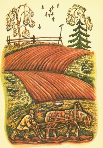 1982 Fourteen (of sixteen?) numbered postcards by Nikolai Romadin of fables and stories by Leo Tolstoy. 4⅛" x 5⅞". Moscow: Sovetsky Khudozhnik. Seven of them for C$14.99 and five for C$22.50 from Lovelystamps, IL, Israel, on Ebay, Sept., '21. Card #6 for AU$15.98 from postcardsworld through Ebay, Sept., '21. Card #3 for C$4.99 from block36 through Ebay, Sept., '21.