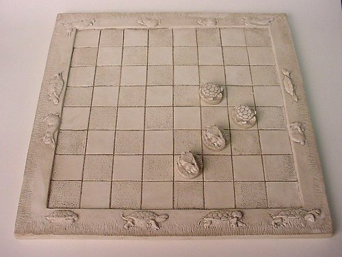 1980? Tortoise and Hare Checkers Board Game. Board, supporting base, instructions, and thirteen pieces each of tortoises and hares. Beige. About 12" square. The supporting base is broken. Hand-made in China. Hen-Feathers, King of Prussia, PA. $17.50 from ReturnBuy, Inc. through Ebay, May, '01.