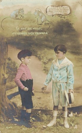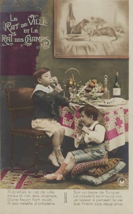 My, there was lively competition in the early twentieth century in Paris in producing colored photographic postcard series of fables! The piling on of specifications in that last sentence surprises even me! This set is closest to Chloro-Platine WL and shares the same symbol, "SE," in the lower right corner. As that set has the number 3142 on each card, so this set has 3127. That is a five-card set, apparently complete, and I believe that this four-card set is missing a third card in the middle, especially because those four verses are the only ones left out of the fable on the cards we have. Here, as there, we have lovely coloring distinguishing the two "mice" as they are played by children. How was that coloring done at the printer's? Especially fetching in this presentation, I believe, is the scene of the two mice devouring the city banquet! Now to find that fifth card! All four were sent in 1918 to the same "Cher Cousin Alfred Pepin" (?) in "Secteur 125."