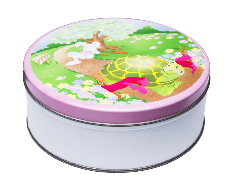Tortoise and Hare cookie tin. No identifying markings other than a TH illustration on its circular pink cover. Plain white sides. 7¼" in diameter, about 2¾" high.