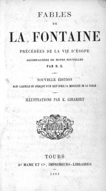 This is a combination book that includes a 45 rpm record, with eight fables narrated by Gerard Philipe. Its first gift to me is that it shows the source for the illustrations used on the lovely menus produced for La Compagnie Générale Transatlantique in 1957. These are lovely watercolors! Each of the eight fables has a full-page (7¼" x 7¼") colored illustration: MM, "L'Ane et le petit Chien," WL, "Le Singe et le Dauphin," FC, "Le Petit Poisson et le Pêcheur," "Le Coche et la Mouche," and "Le Loup devenu Berger." My prize goes to the milkmaid! She is also on the cover. I do not know if the "1" on the cover and title-page suggests that there are other books of La Fontaine in the series, or merely that La Fontaine is the first in the disque-album series. The hunt continues!