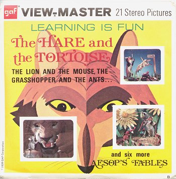 At last I have found the View-Master Aesop that I have looked for so long! In GA the grasshopper has slept all summer and then danced in the fall; the former helps set up a rhyme for the fact that he wept in winter. DS gets only two images. There is a great leaping fox in the one image for FG! TMCM features great lighted eyes on the cat, and a fine paw reaching inside the TM's hole-home. TH has a great leaping hare at the race's start. The other fables here are FC, SW, FS, and LM. A sixteen-page color illustrated booklet parcels the story out among the slides. The set comes in a Special View-master outer envelope and inner packet. The reels themselves are in excellent condition. The copyright on the reels has changed from Sawyer's to GAF Corporation. - Date