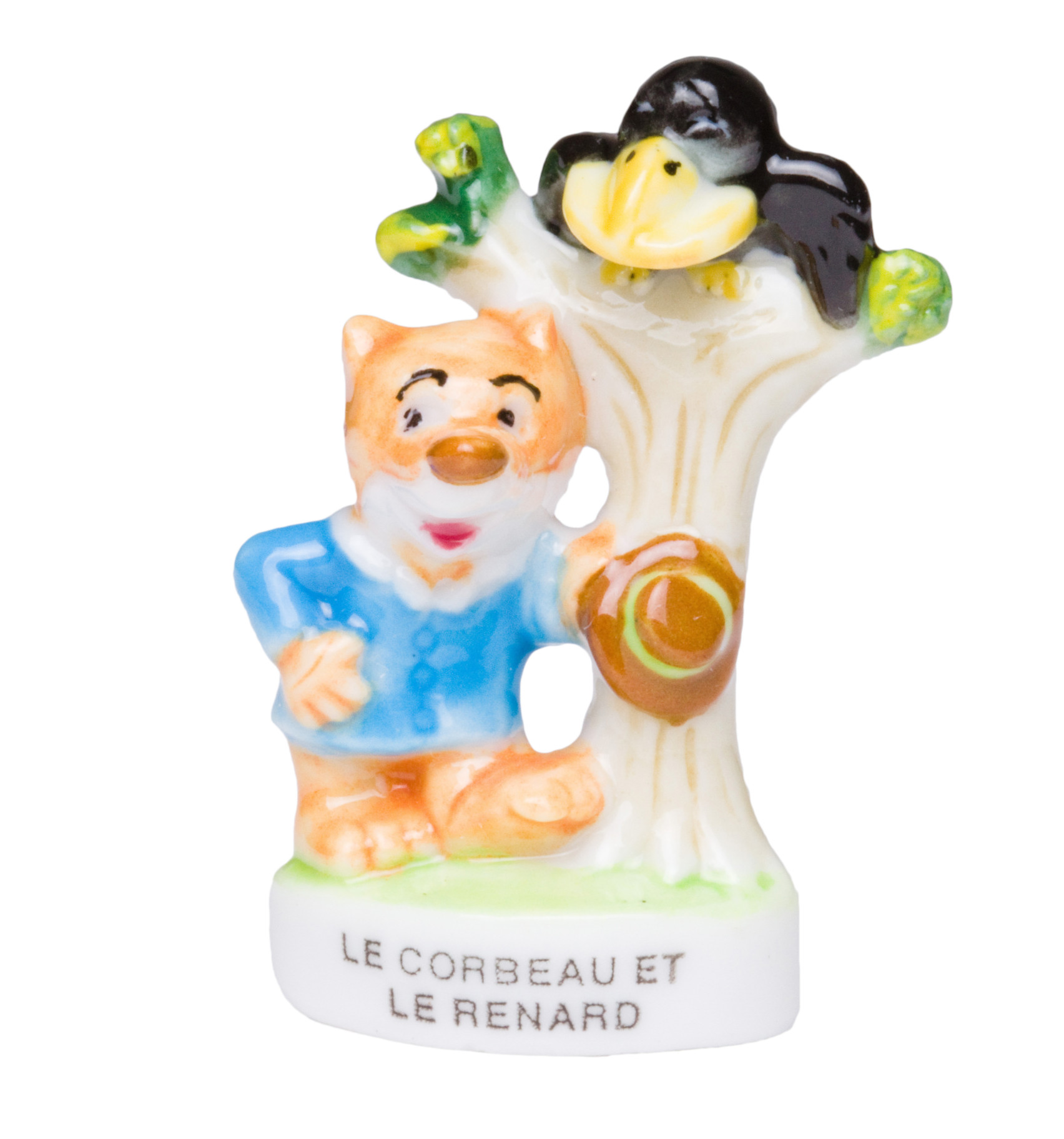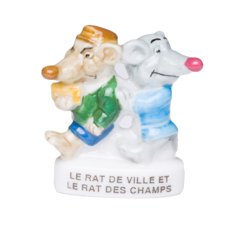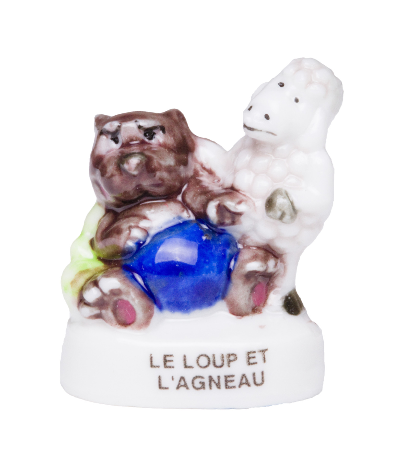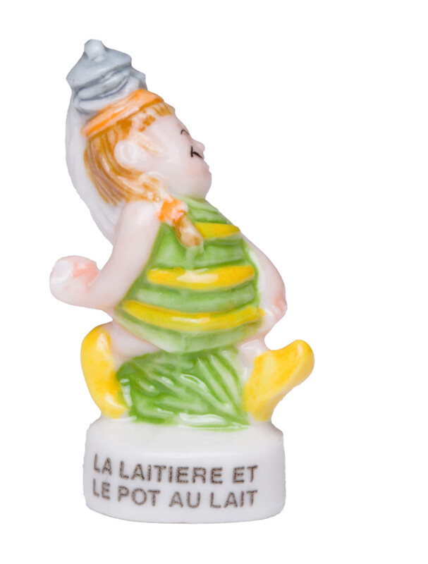 As can happen with such small sculptures, the results are sometimes a little bizarre. The milkmaid is pictured quite differently, for example, from other illustrations of this fable. WL seems to miss the fable quite entirely. WC, by contrast, seems quite successful! Some further investigation reveals that these are eight of the ten feves listed as "Complete Series of 10 Fables Feves" but without FG and LM. These are differently colored: that is where some of the "bizarre" comes into play. - Source