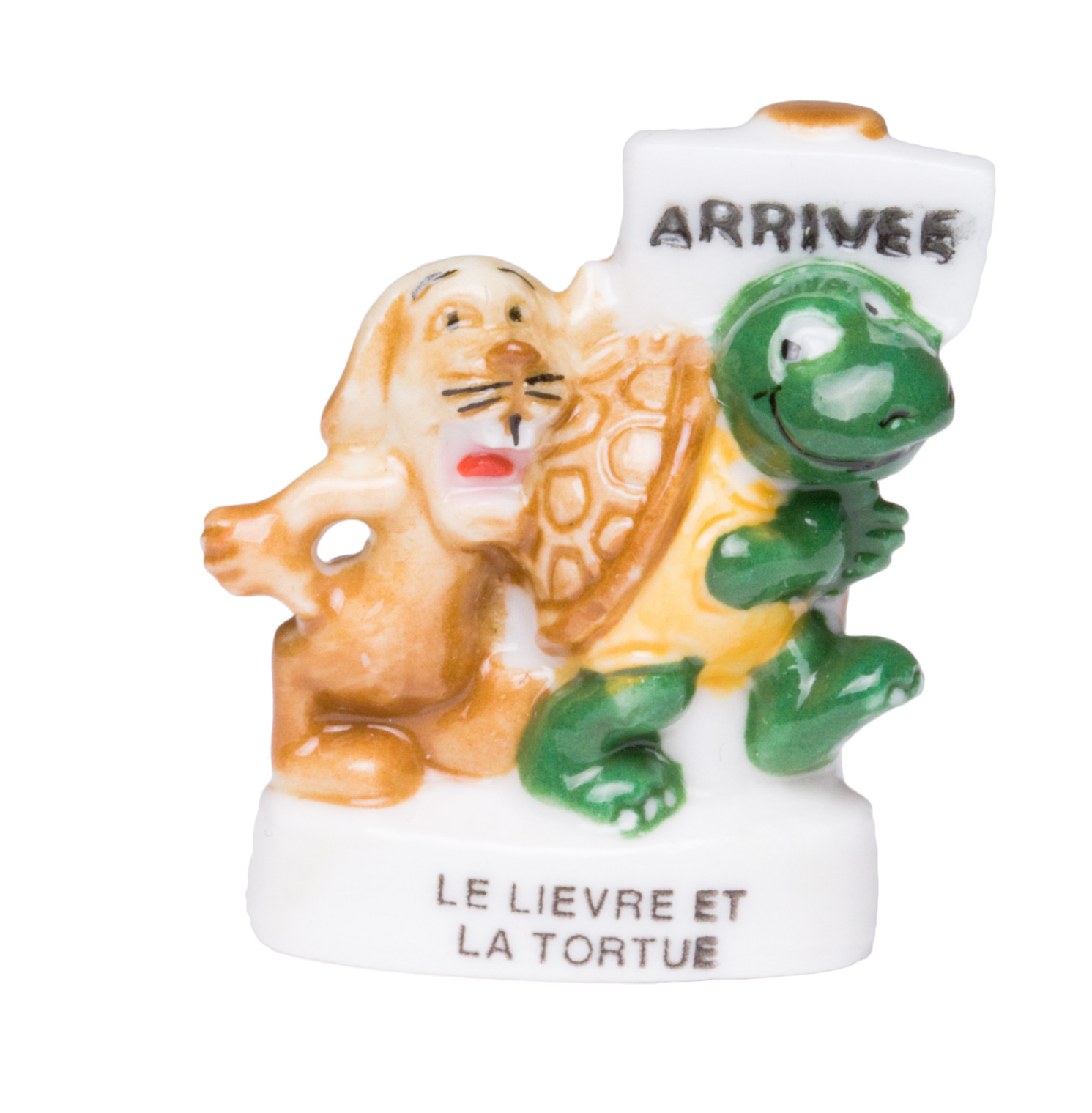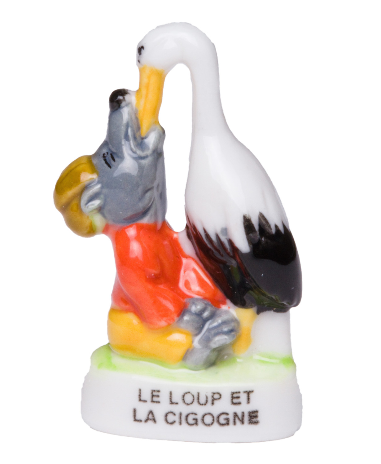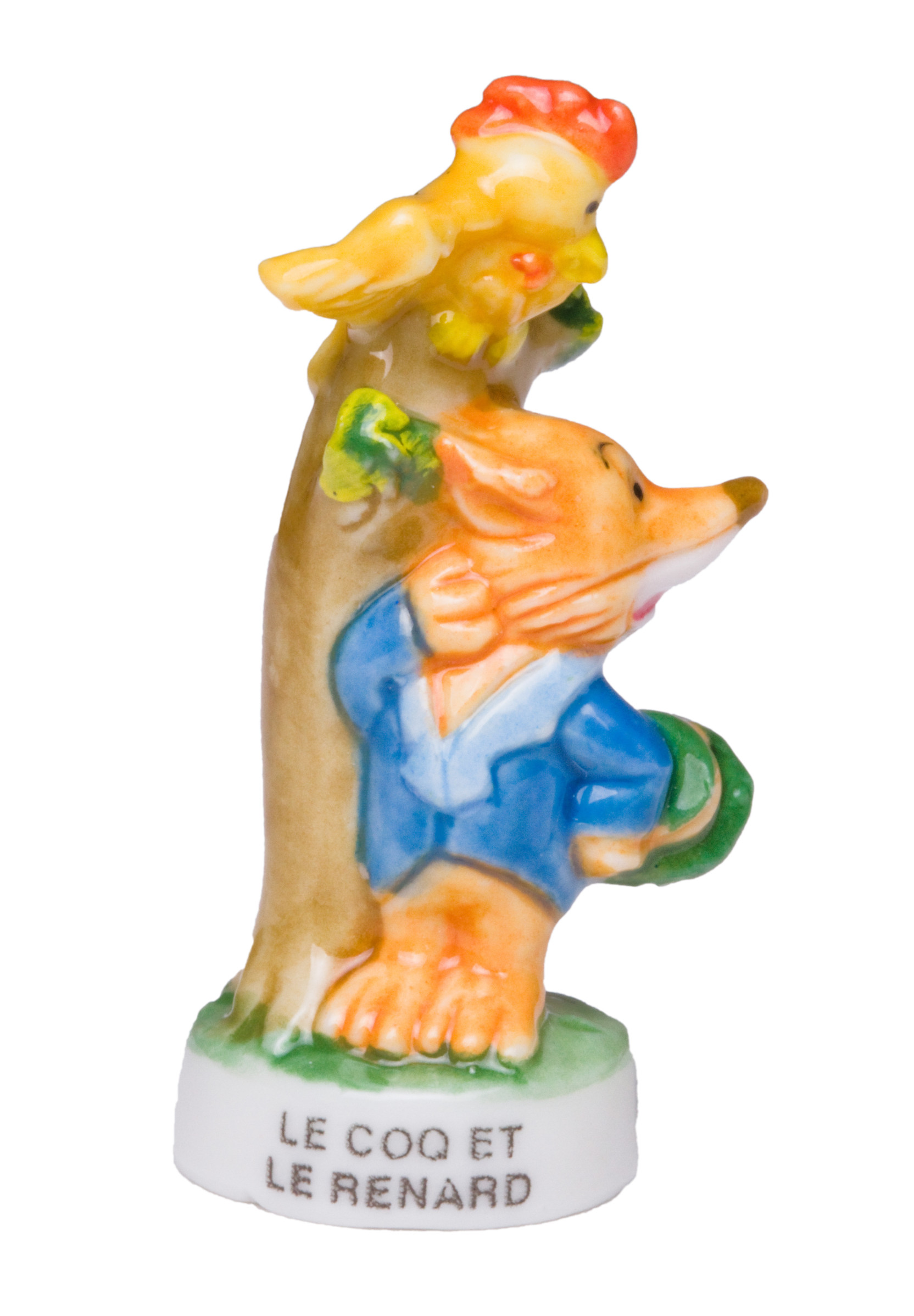 As can happen with such small sculptures, the results are sometimes a little bizarre. The milkmaid is pictured quite differently, for example, from other illustrations of this fable. WL seems to miss the fable quite entirely. WC, by contrast, seems quite successful! Some further investigation reveals that these are eight of the ten feves listed as "Complete Series of 10 Fables Feves" but without FG and LM. These are differently colored: that is where some of the "bizarre" comes into play. - Source