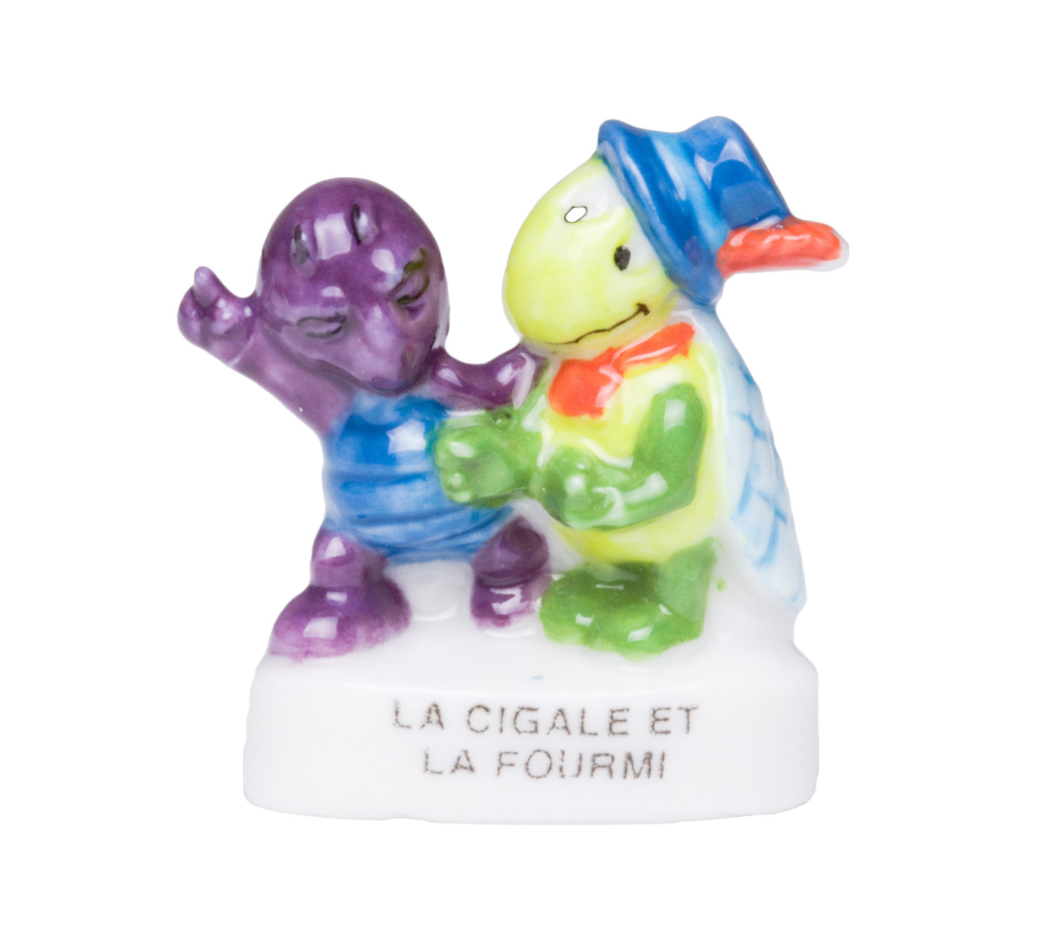 1980 8 different fables illustrated by fèves. From various vendors online and at French flea markets, through August, '15. One duplicate of TMCM as a cadeau offered with other fèves.