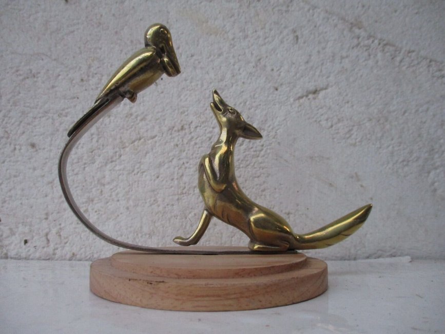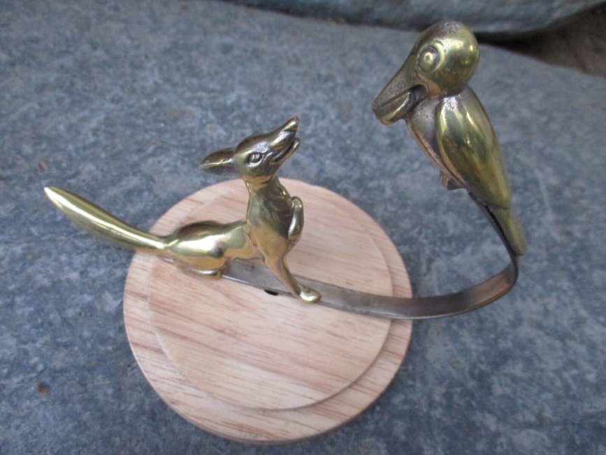 Here is another unusual creation! The creator either made or found the two brass figures and matched them with each other by means of a single metal strip. They attend to each other perfectly. Is that a begging stance we see in the fox, with one leg folded over his chest? The swoop of his tail completes the round of this lovely piece! - Source