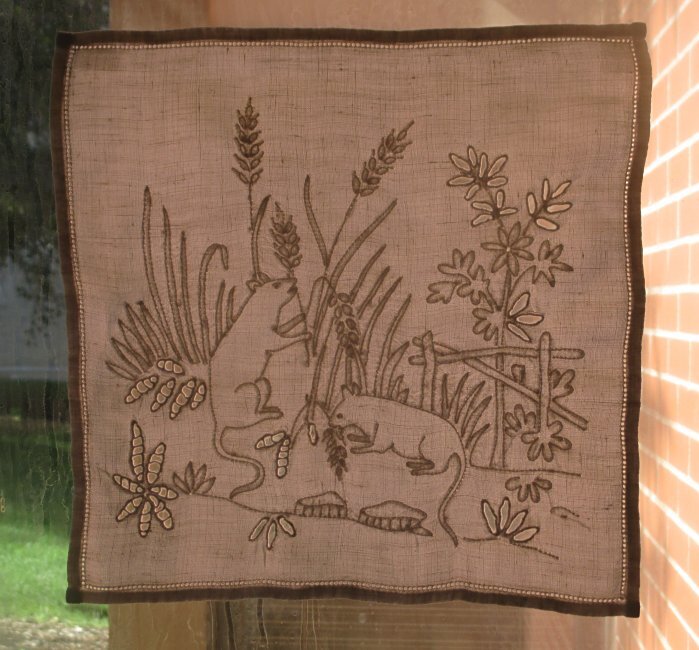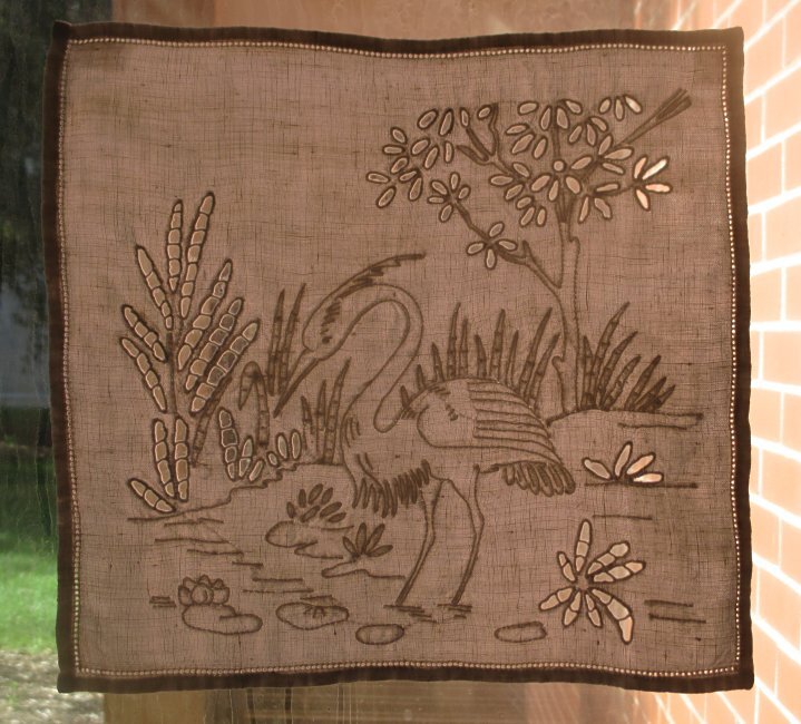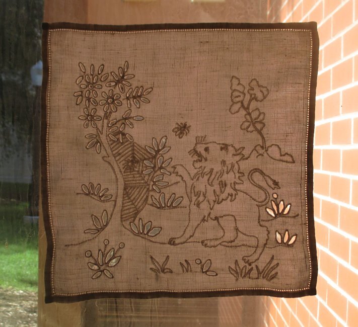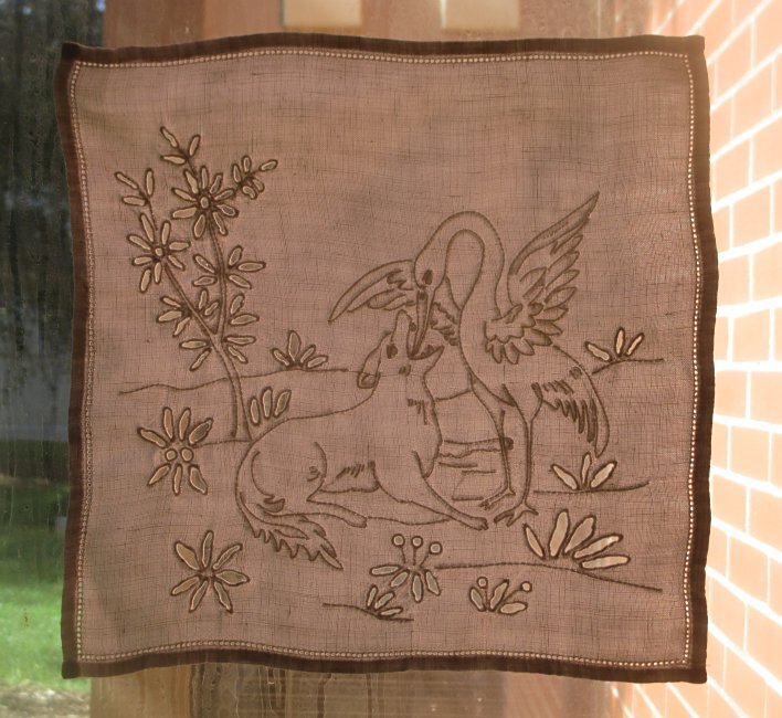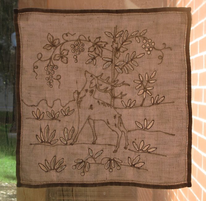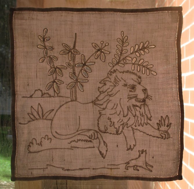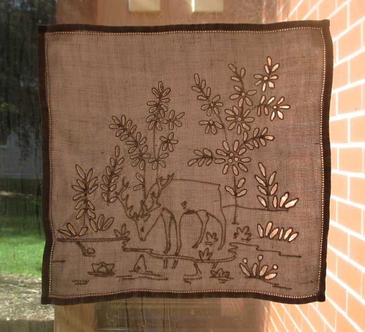 Here is another surprise. I hope these were never used as napkins! My first and second attempts to photograph these worthily failed, as the white thread does not stand out from the white background in a normal photo. Those experiences explain my decision to photograph them on a window that allows the back light to highlight the heavier threads that make up the designs. Lovely work! Click on the napkin above to see all eight. - Source