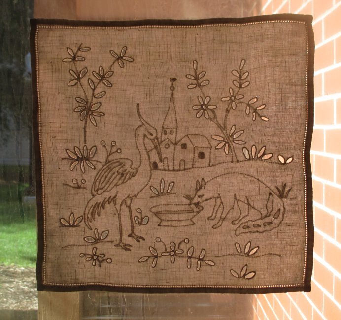 1950? Set of 8 different La Fontaine fables embroidered large linen cocktail napkins. $270 from Curated Store through Ebay, Feb., '20.