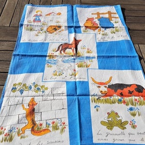 1990? French dish towel featuring five fables: MM; 2P; WL; FG; and OF. $17.887 from froufrouretro through Etsy, Dec., 20.