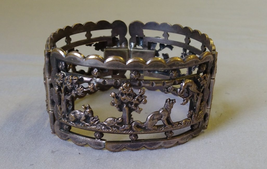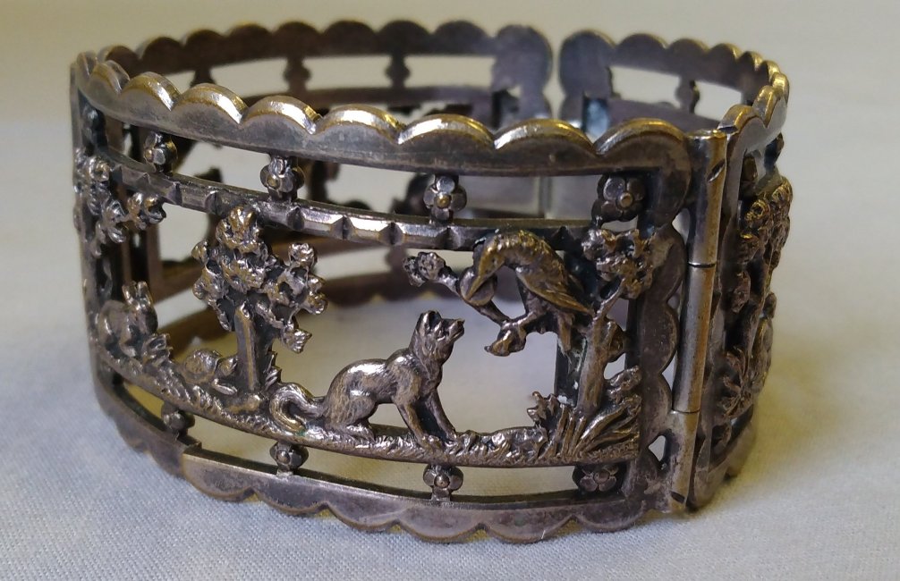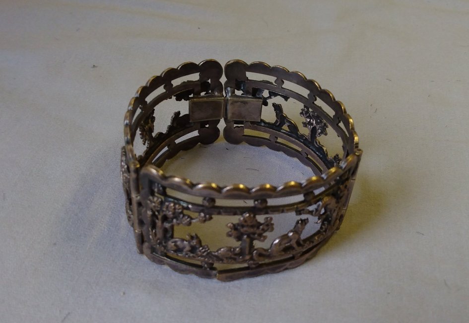 This is a gorgeous piece. I have tried to render its detail but fear that I have failed. The bracelet is heavy. Its serious clasp bears, in English, "Made in France." Similar bracelets on the web seem to be in the $200+ range. - Date