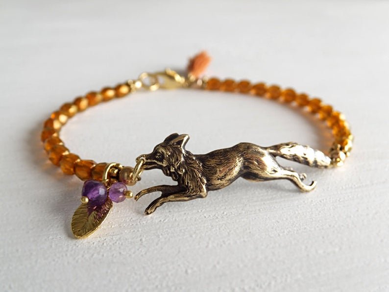 2020? Fox & grapes bracelet. Autumn gold woodland fox with orange amber beadings. $19.60 from LycheeKiss through Etsy, Dec., ’20.