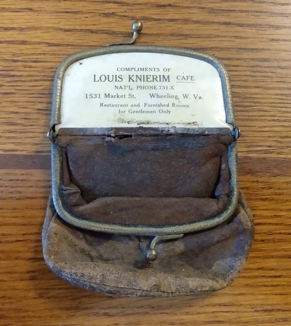 1930? Coin purse advertising Luis Knierim Café. "Restaurant and Furnished Rooms for Gentlemen Only." Wheeling, West Virginia. Image of "The Frog and the Mouse." Gift of Susan Carlson, May, '22.