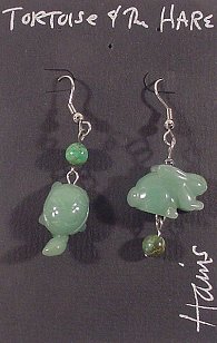 1997? Tortoise and Hare Earrings. Jade colored stone with a bead for each character. Made by Maryellen Hains, Kalamazoo, MI. From an unknown source.