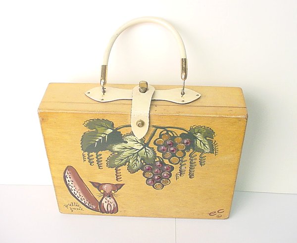 1962 Wooden purse signed by Enid Collins. Titled "Pretty Foxie." 8½" x 11" x 2¾". Cream leather, cream plastic handle, and brass hardware. $37 from Ginny Chenowith, Las Cruces, NM, through Ebay, Sept., '00.