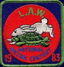 1983 Embroidered TH patch commemorating the L.A.W. Metric Century Bicycle event in 1983. 3" square. $7.51 from John and Deb Brodahl, Greensburg, PA, through Ebay, Jan., '02.