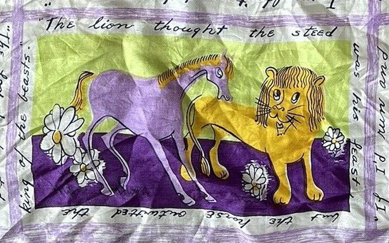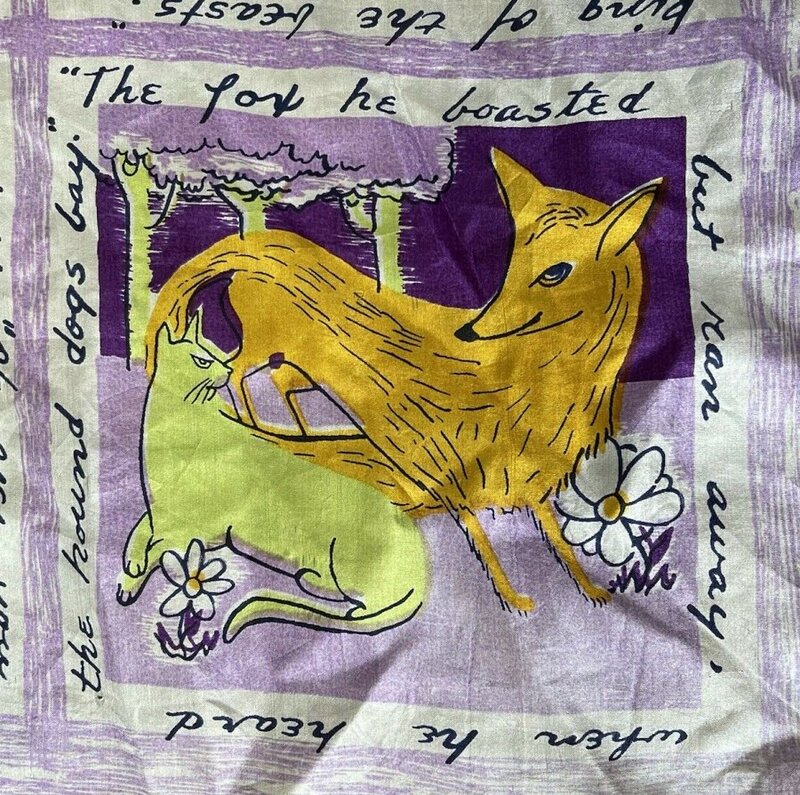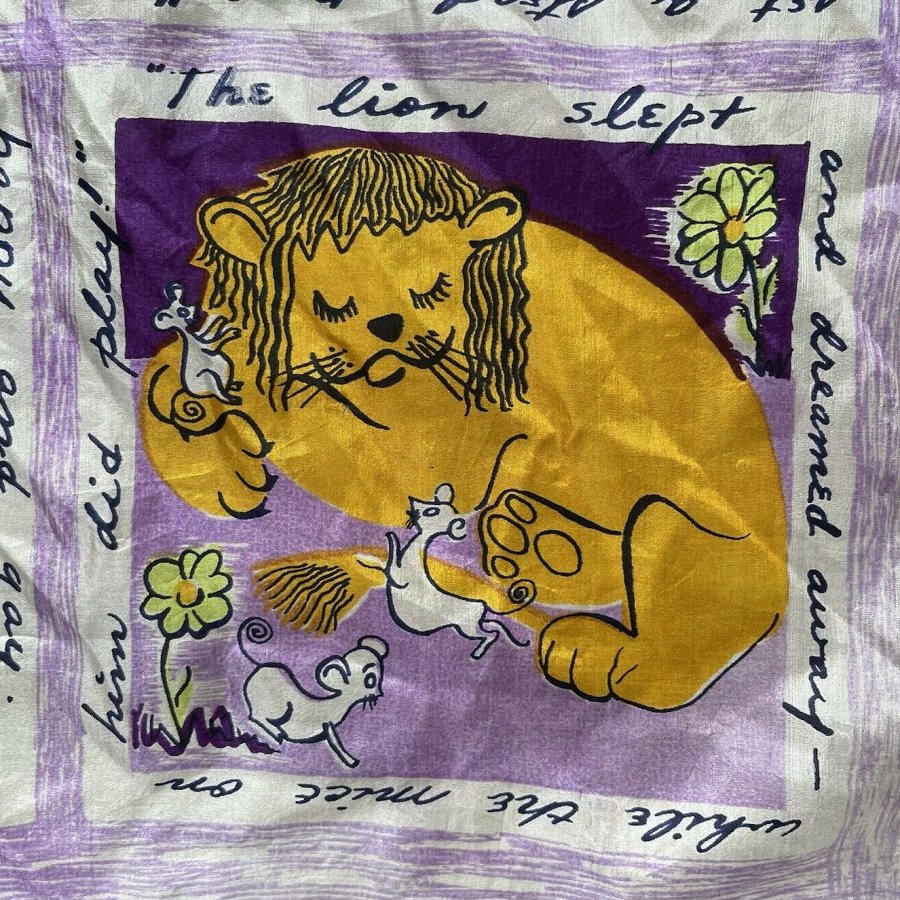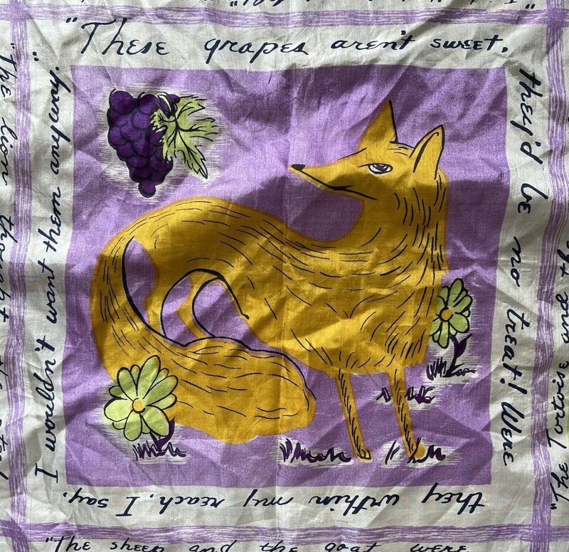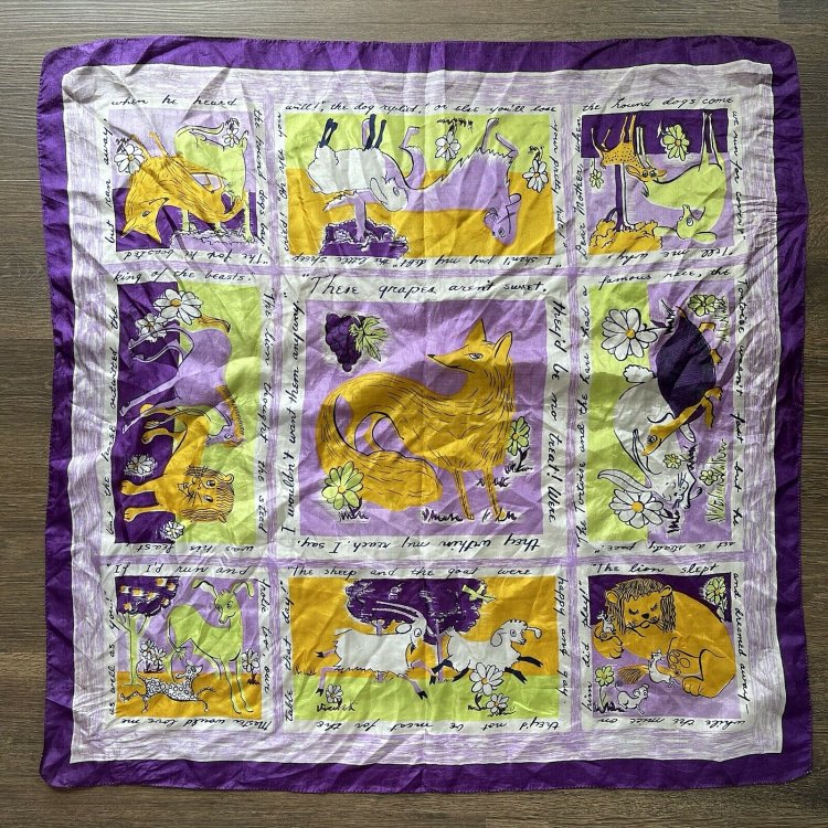 2000? French silk scarf about 33½” square depicting Aesop’s fables with English language quotations around each of nine images. $60 from GravityGoods, Aumsville, OR, through Ebay, August, ’21.