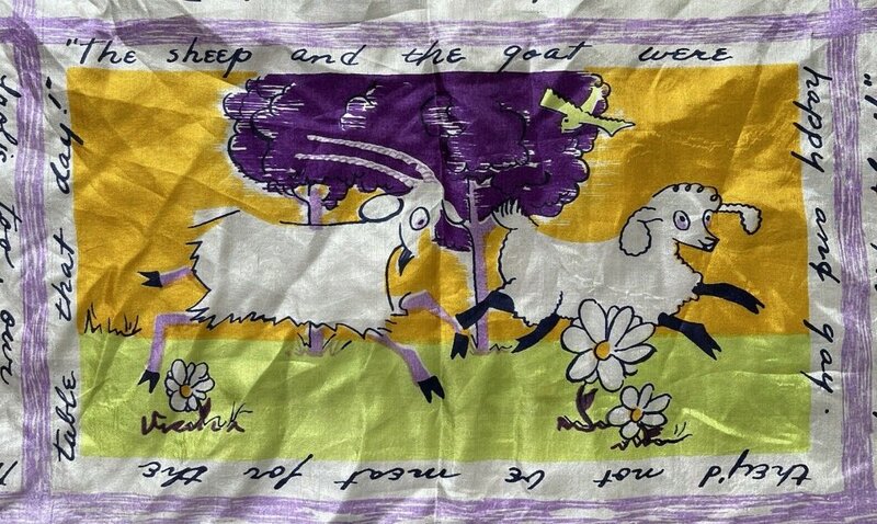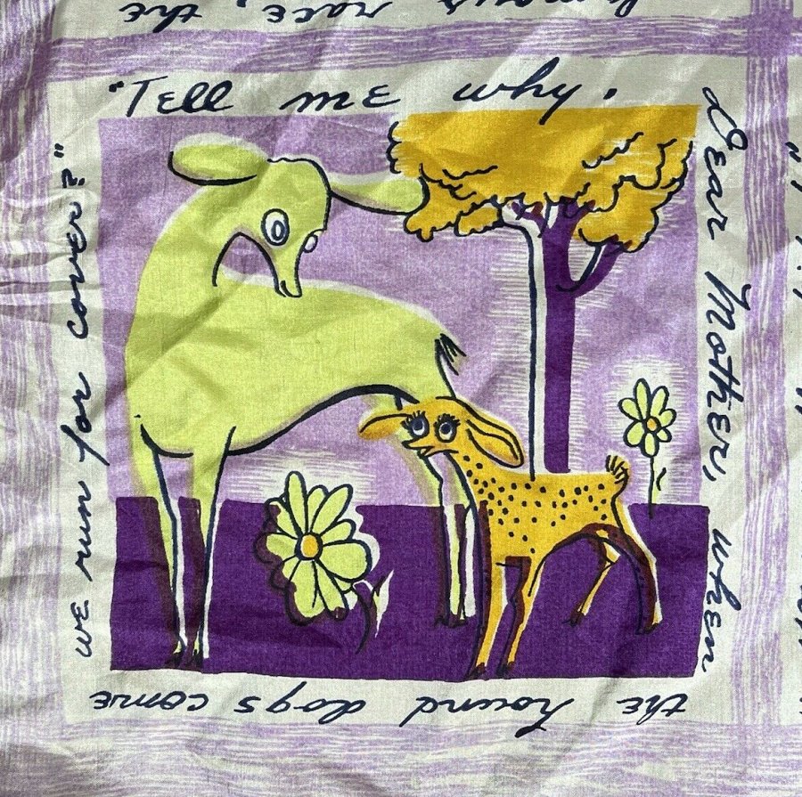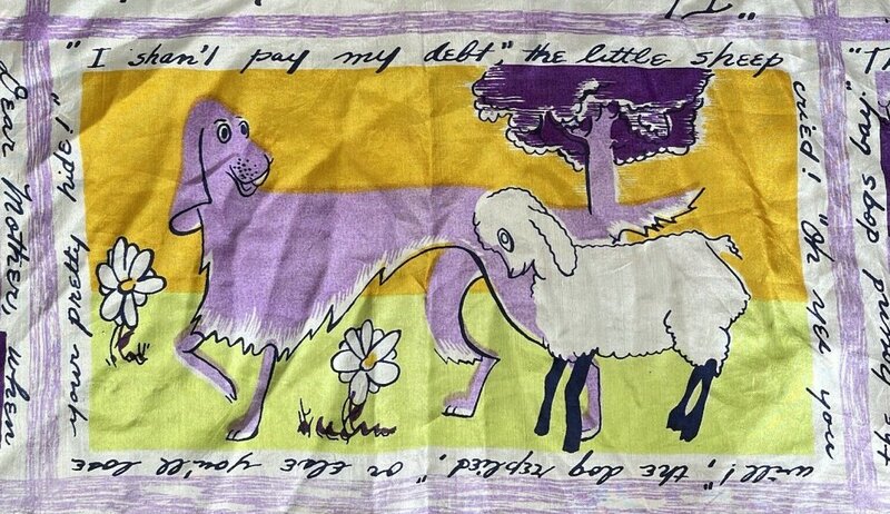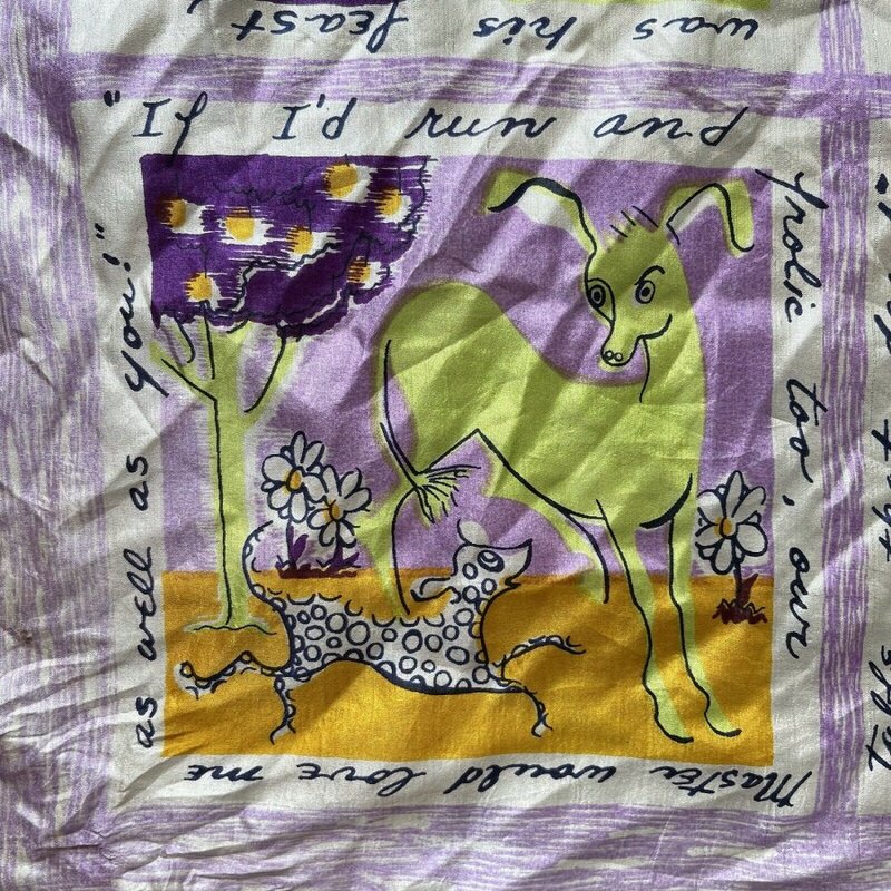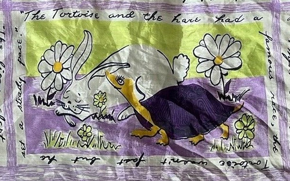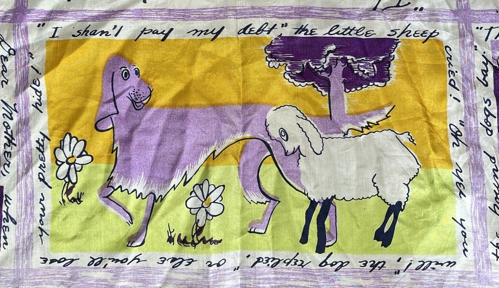 2000? French silk scarf about 33½” square depicting Aesop’s fables with English language quotations around each of nine images. $60 from GravityGoods, Aumsville, OR, through Ebay, August, ’21.