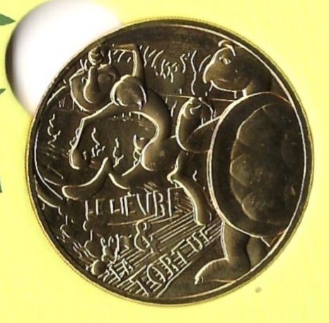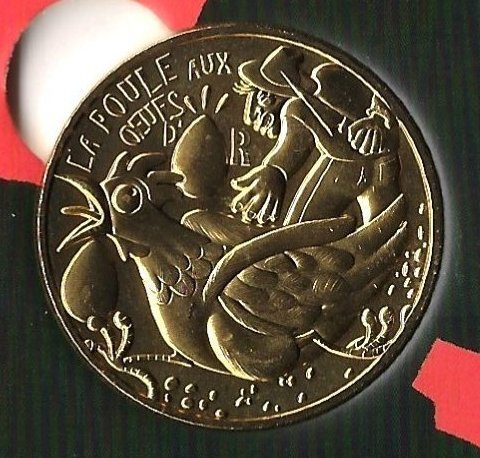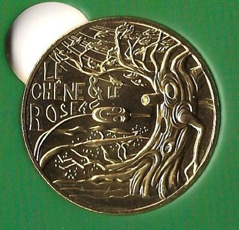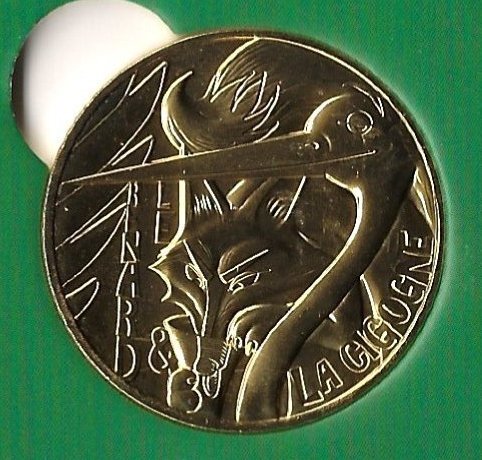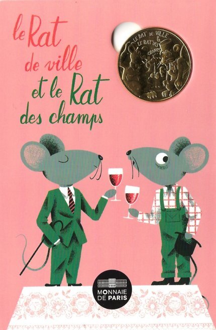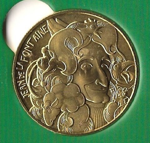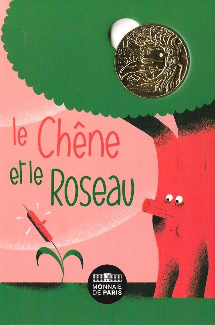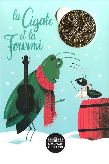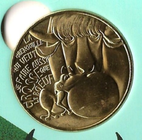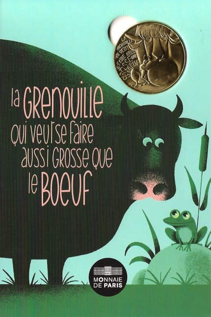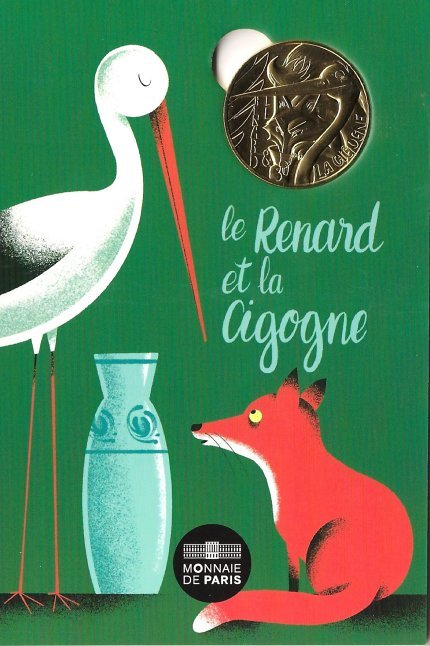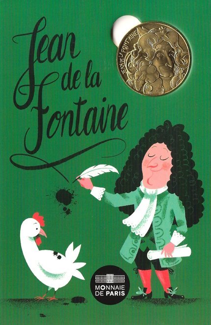How to pay tribute to Jean de La Fontaine without mentioning the Fables? Monnaie de Paris wanted to celebrate the 400th anniversary of the poet by reinterpreting his work. The reverse of each card contains the complete fable in its original version. Both the cards and the coins are nicely executed! I negotiated with the seller to avoid the ridiculously high postal charges; for that I had to give up getting an original box. - Source