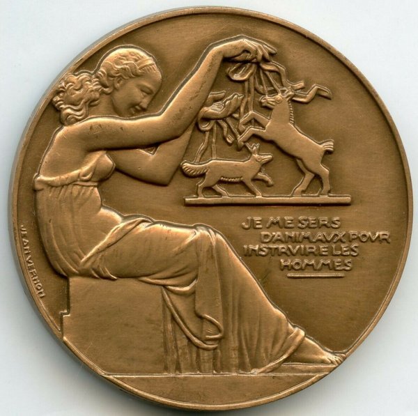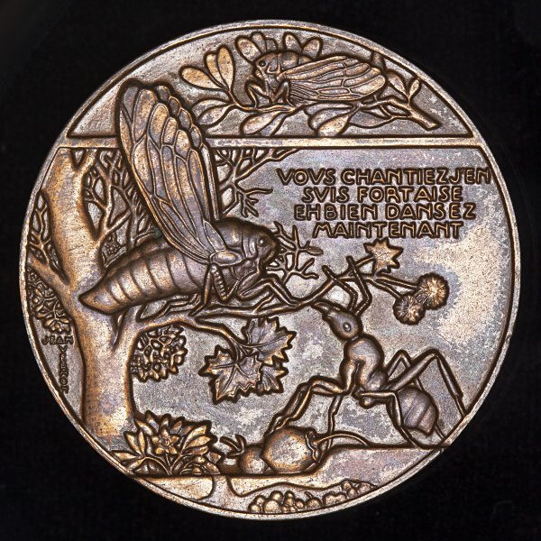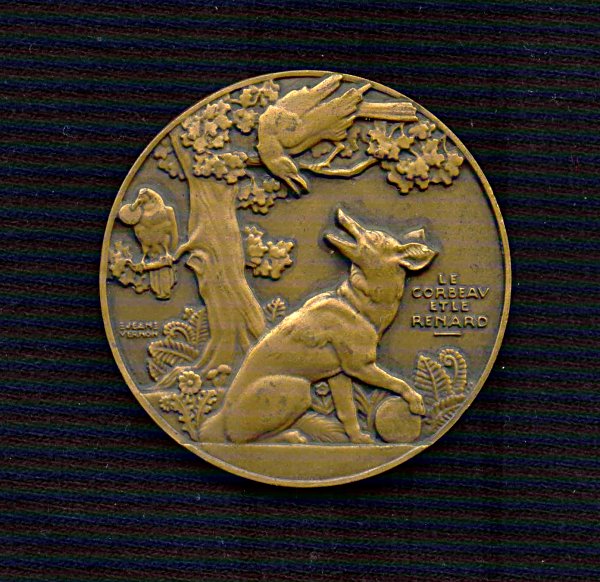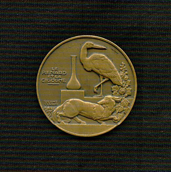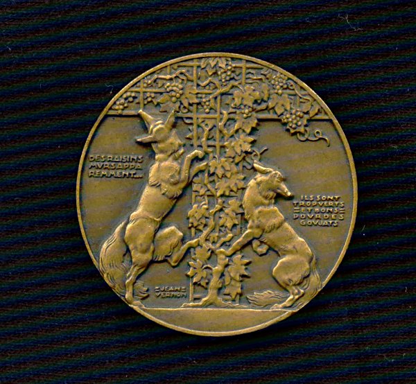 1950? Five bronze medallions depicting fables of La Fontaine. Artist: Jean Vernon. Nothing on the verso. Three came for $31 or $32 each from James Johnson, Tucker, GA, through eBay, August, '05. Two-sided medallion of La Fontaine and his muse for $25 from numest, Talinn, Estonia, through Ebay, August, '21. "Fox and Goat in the Well" for $4.99 from T. Lantz, Isle of Palms, SC, through Ebay, May, '22.