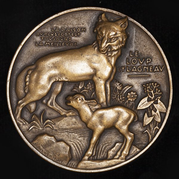 These smaller medallions are in exactly the same style as the 2½" variety. The fiveI have are FC, FG, FS, GA, and WL. FG has something other than the title of the fable and the artist's name: "Ils sont trop verts et bons pour les goujats." Similarly, WL has the opening lines of its fable, and GA the closing line of its. The workmanship is excellent. I continue to pursue the question of whether some medallions were cast only in the smaller format and others only in the larger--or whether there were two complete sets, and how large they were. Are there more out there? I will give the "La Fontaine" medallion its own row, to show both faces. - Source