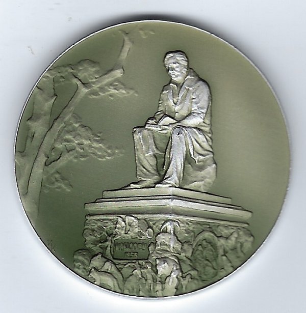 1990? Gray medallion of Ivan Krylov as in his famous statue in St. Petersburg. Porcelain? Verso with symbols including a dramatic mask, a lyre, a laurel wreath, and text. $20 from an unknown source, Sept., '18.