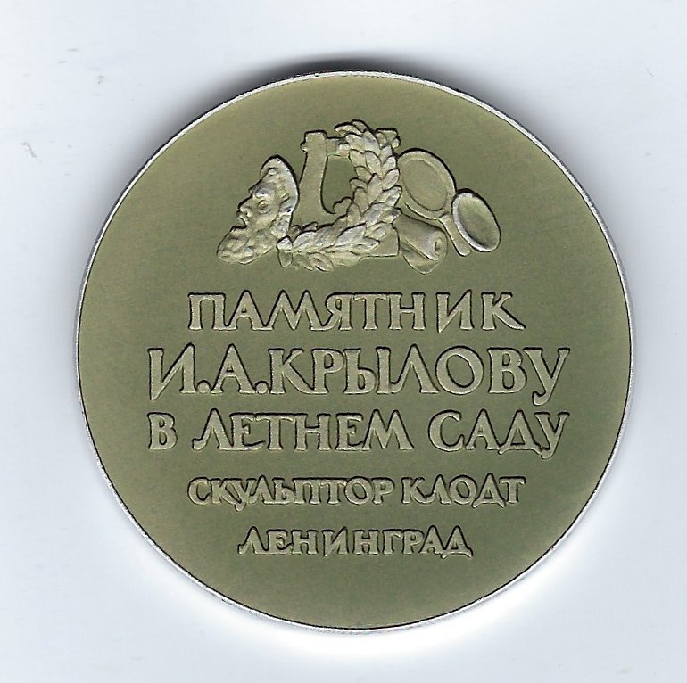 The writing on the back includes "I. A. Krylov"; "Sculptor (Peter) Crodt"; and "Leningrad." Other elements seem to include something like "Lamjatnik" and "B. Detnem Sady." Sorry not to comprehend or even transliterate those better! Use of "Leningrad" rather than "St. Petersburg" puts the medallion before 1991, when the name was officially changed to "St. Petersburg." I have sought in vain to find a comparable piece on the web. - Source