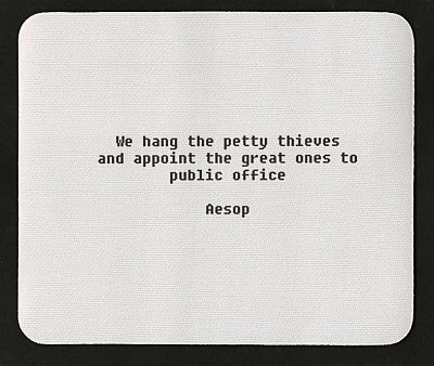 2008? Mousepad quoting Aesop: "We hang the petty thieves and appoint the great ones to public office." $.99 from books4uandotherstuff, Albuquerque, NM, through eBay, Oct., '08.