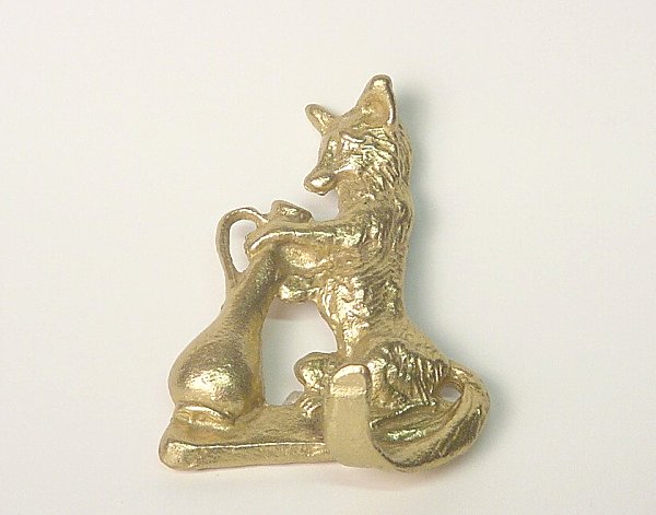 1980? Three pair of brass wall hooks showing the fox looking down into the stork's vase. His raised tail forms the hook protruding more than an inch from the metal fixture. 3¼" x 4¼" high. Through Ebay. Further particulars seem lost!