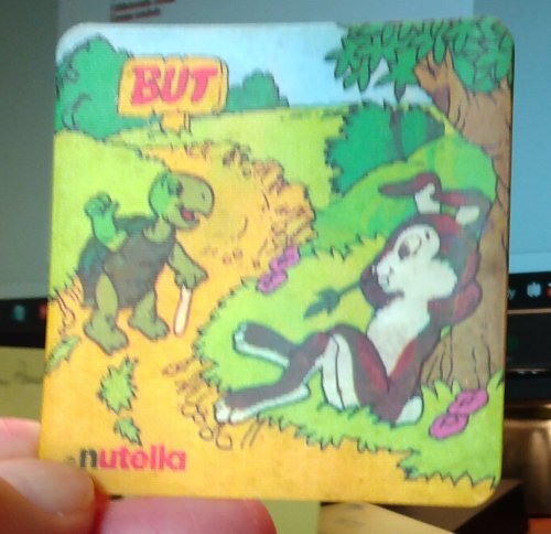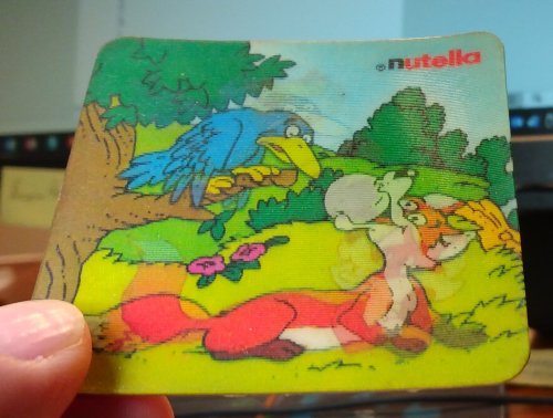 1980? Two each of two Nutella "visiomatic" coasters presenting one of La Fontaine's fables, specifically TH and FC. 1½" square. €15.80 for the group of four from eugtara-20 on Ebay, Feb., '23.