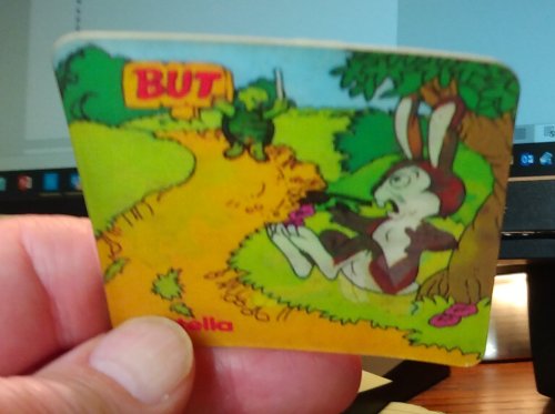 First, I am unsure if these are really coasters. I am not sure what their other use would be. Secondly, the verso says that this is a series of 6 fables. I would love to find the other four! Thirdly, it is hard to show the character of these "visiomatic" scenes, especially because, in these instances, the makers are not completely successful in bringing the whole scope of movement into the normal visual field. Adjusting the angle of vision from up to down reveals the whole scene, for example, of the cheese moving from the crow's beak to the fox's mouth, who eagerly consumes the cheese. Similarly, the tortoise passes by the hare while he is awake, but soon reaches the goal while he sleeps and then awakes with a start. After several attempts, I will here show, quite imperfectly, what the "before" and "after" of each is like in a still photograph. These are better seen in action! - Source
