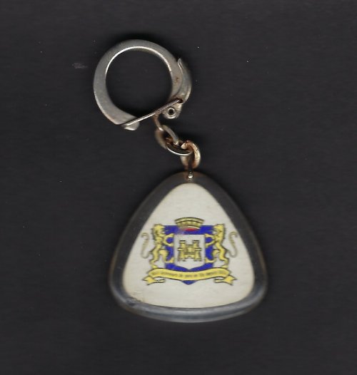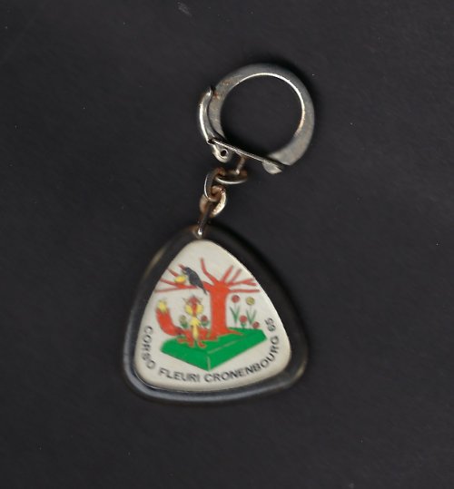 1950? Keychain by Cronenbourg Beers CORSO FLEURI 65. The keychain contains a plastic triangle showing the fable La Fontaine “Le Corbeau & Le Renard.” The verso shows the brewery’s coat of arms, as established in 1664. €5 from Rougemaisonuser on Ebay, Nov., ’20.