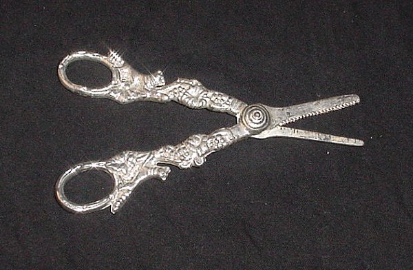 Am I correct in presuming that this is a grape scissors for cutting bunches of grapes from the larger bunch or vine? Is that silver plating that is tarnished? Click on the image to see it enlarged. - Source