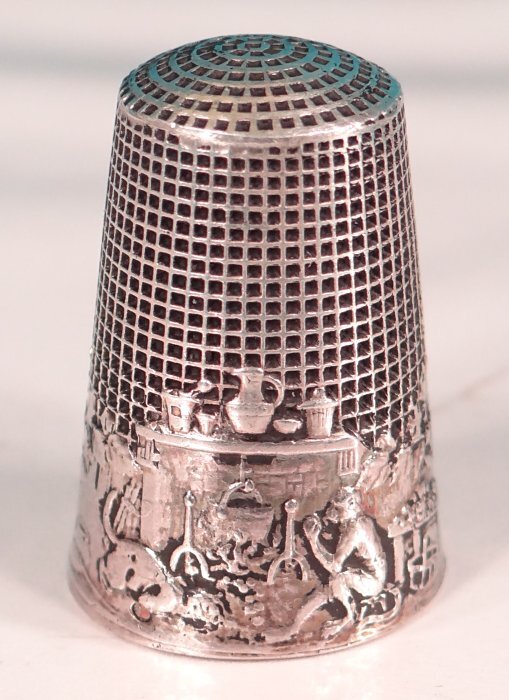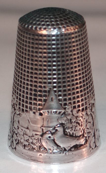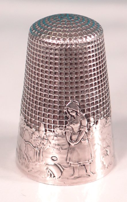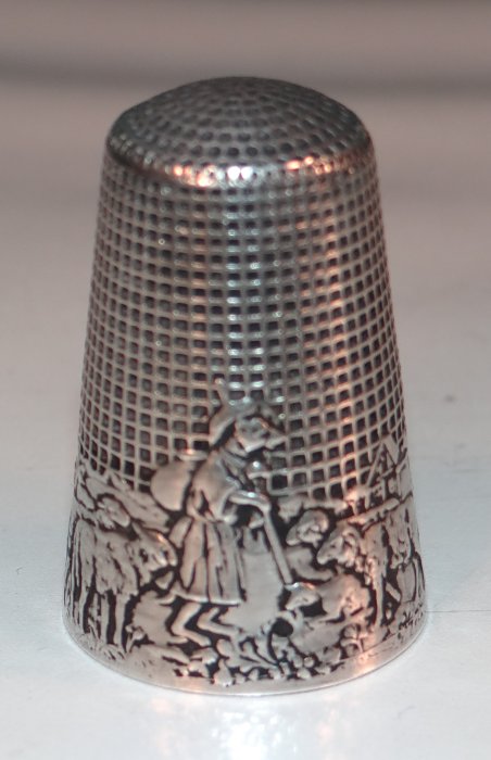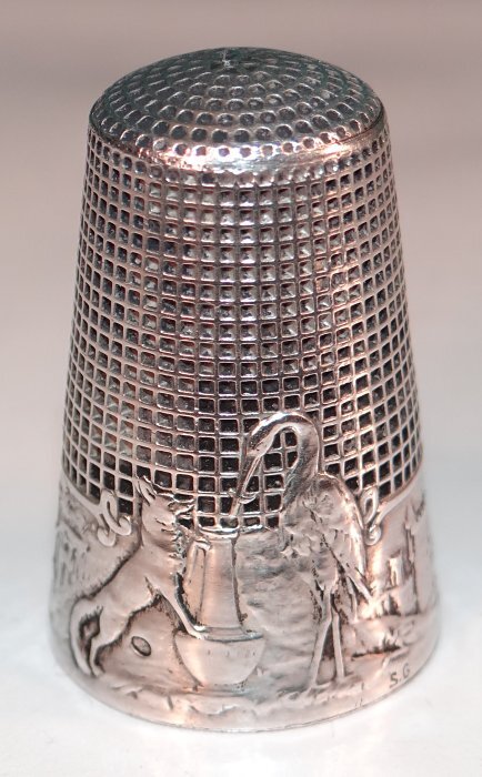 I am delighted at last to get a group of fable thimbles. Thimbles appear from time to time on Ebay, but apparently there are so many thimble collectors that they drive the price up. I was happy to get these as a group: MM; WL; FS; TH; "The Wolf Turned Shepherd"; and "Two Pigeons." Photographing such small things proves to be a challenge! My sense is that these are imitations of the 1900 originals produced by Maison Lorillon. Photos on the web suggest that, while the Lorillon series may have been large – perhaps twenty? – the later Lenain series may have included only about eight Since "Red Riding Hood" is not a fable, the fable set here includes seven. A few months later, I was lucky to find the only one not found in that purchase, "Bertrand (monkey) and Raton (cat)." I believe that this completes the fable portion of the 1970's set. Comparison of the Lorillon and Lenain productions on the web suggests that the Lenain imitations, like these, follow the patterns of the Lorillon originals but are less distinct. Several of these have distinct Lenain signs (crossed L's that come out looking like an "X") and a size number, here '10.' - Source