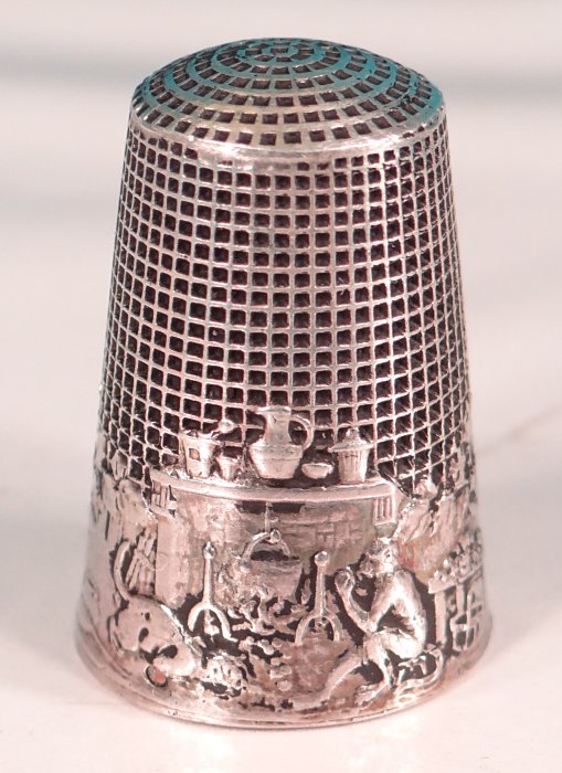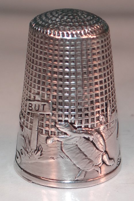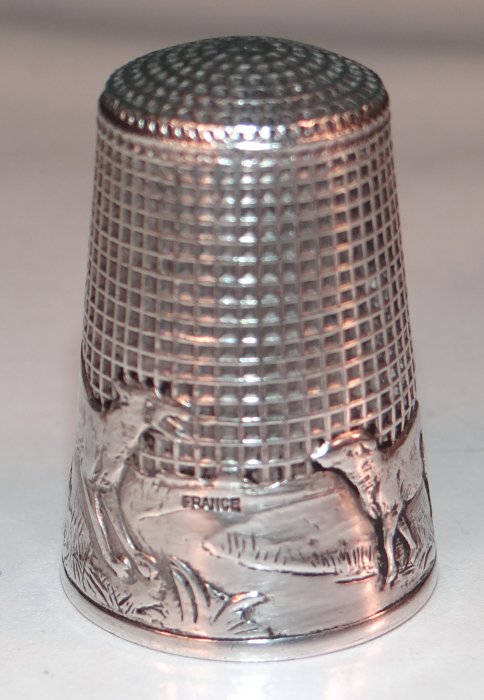 1970? Seven French sterling "Fables of La Fontaine" thimbles, likely produced by Lenain in the 1970's. Six for $360 from Industrial-Blonde, Houston, TX, through Ebay, May, '19. Bertrand (monkey) and Raton (cat) thimble for $52.51 from Alpha Gold Exchange, Baltimore, MD, through Ebay, Nov., '19.